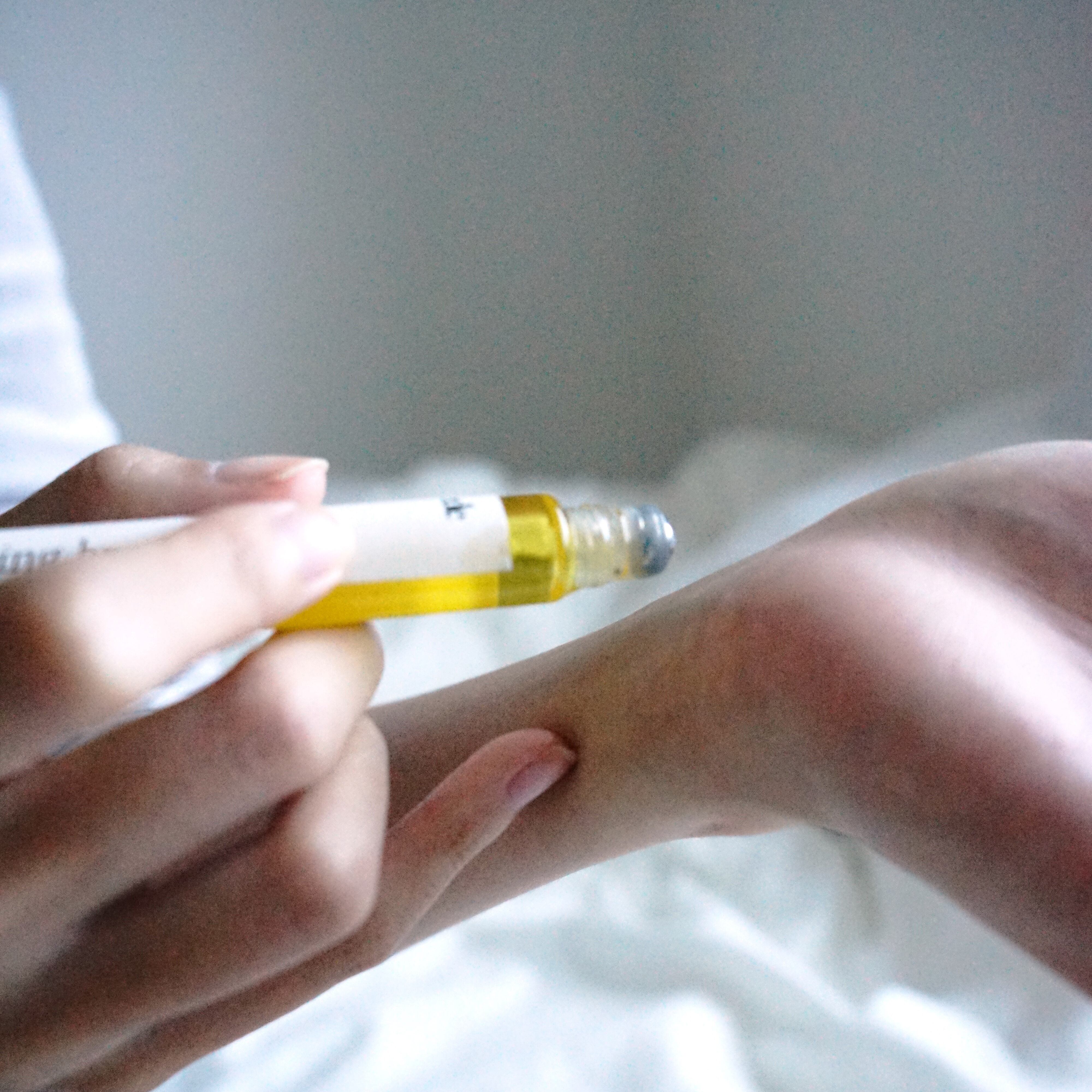 手首の内側、こめかみ、その他のパルスポイント(脈拍がとれる場所)に転がして、香りを深く吸い込んでください。